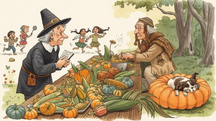 Greetings from the Autumn of 1621! That’s right—your faithful gardening reporter has hitched a ride in a horse-drawn wormhole to bring you a firsthand report from the very first Thanksgiving celebration held right here in Plymouth Colony.