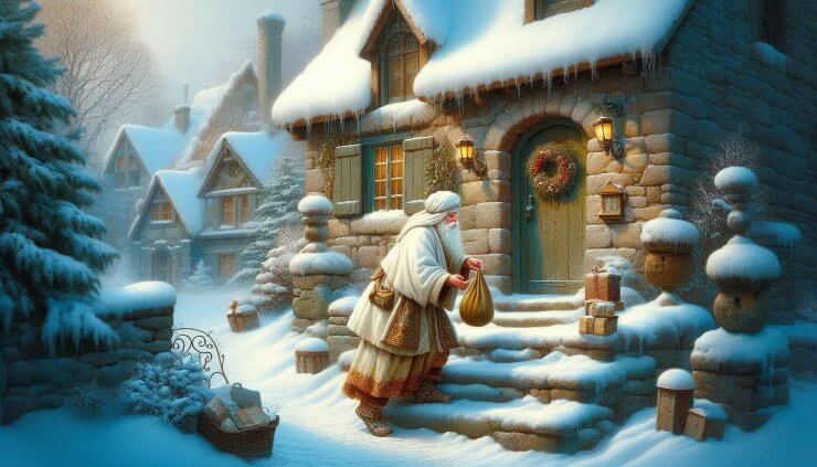 Late that night, Nicholas threw a bag of money up into the house, enough for the first daughter’s dowry. The next night, he came and threw in another bag for the second daughter. The third night, he hefted in one more bag for the third.