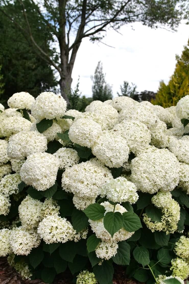Gardeners love the enormous blooms of smooth hydrangeas, but traditional varieties can sometimes flop after heavy rain. Incrediball Storm Proof hydrangea solves that problem with the thickest stems on the market, that hold the large white flower heads upright all season long. Because it comes from the North American native species Hydrangea arborescens, it’s also exceptionally cold hardy and easy to grow. The blooms begin lime green, open to bright white, and age back to green, providing months of interest in sunny or lightly shaded gardens.