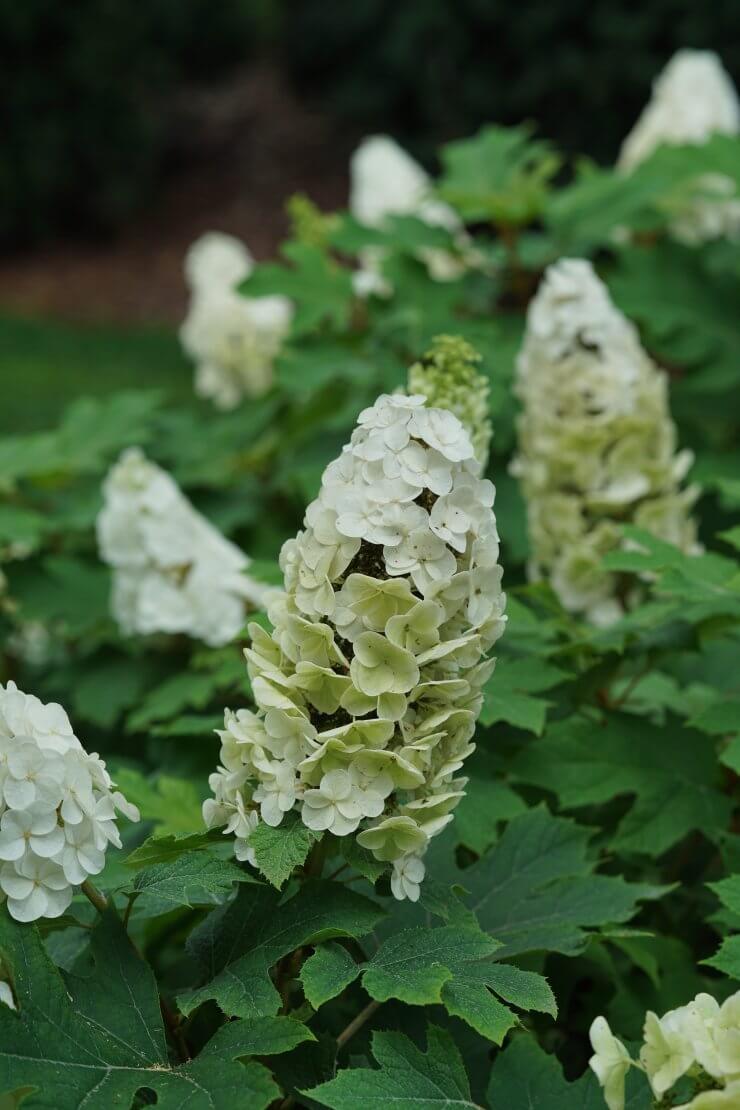 Native plants often bring a natural charm to the landscape, and Gatsby Glow Ball oakleaf hydrangea is a perfect example. As a selection of the North American native Hydrangea quercifolia, it carries many of the traits gardeners love about oakleaf hydrangeas, including slightly twisting stems, oversized foliage, and impressively large blooms. Unlike the towering varieties of the past, however, this cultivar matures into a much smaller, more usable shrub. Its naturally rounded, ball-shaped habit is dense and well behaved, making it easy to incorporate into both formal and woodland-style plantings. Crisp white flowers appear in summer and gradually mature to a fresh lime green, while the large oak-shaped leaves shift to dramatic shades of burgundy and red in fall.
