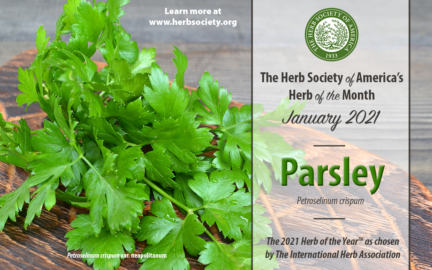 The Herb Society of America: Founded in 1933 by a group of women from Boston, The Herb Society of America is dedicated to promoting the knowledge, use, and delight of herbs through educational programs, research, and sharing the experience of its members with the community. The Society promotes herbs—including parsley—as valuable, useful, and essential parts of our lives. The Society also provides educational resources that allow you to explore topics including herbal history and lore, growing tips and techniques, and details on how to use herbs for flavoring, fragrance, and crafts.